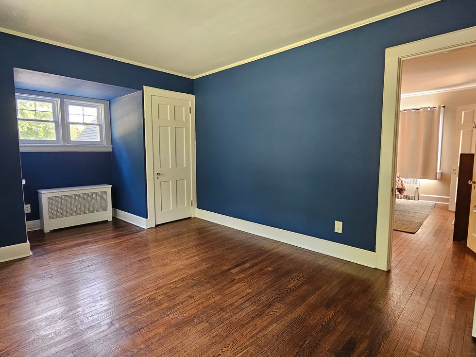 A series of empty rooms with distinct features such as colored walls, wooden floors, and ceiling fans.